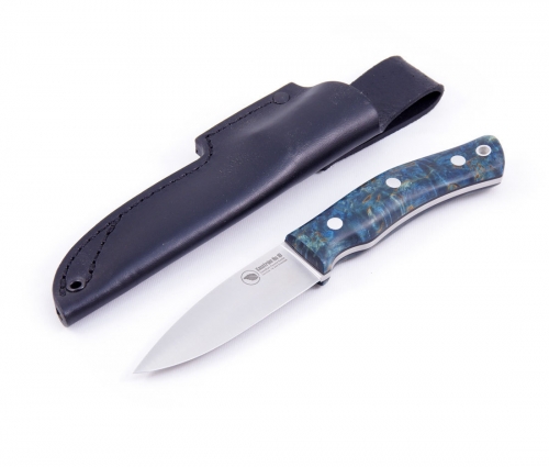 This knife has a handle made from  stabilized birch which produces a completely waterproof finish it is also washable and impact resistant. The wood is vaccum injected with a mixture of hardened methacrylate esters, which increases its density and makes the whole handle resistant to moisture, cracks and hard impact. For this particular model, the mixture was added by blue pigment for a more stylish look.