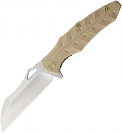 5" closed. 4" mirror finish D2 tool steel sheepsfoot blade. Tan sculpted G10 handle. Lanyard hole. Pocket clip. Thumb pull. Ceramic ball bearing. Black nylon zippered storage pouch. Includes cleaning cloth and knife tool. Boxed.