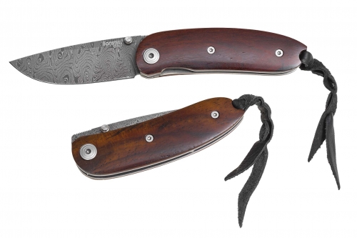 3 1/8" closed linerlock. 2 3/8" Damascus steel drop point blade with dual thumb studs. Santos wood handles. Leather lanyard. Wooden presentation box.