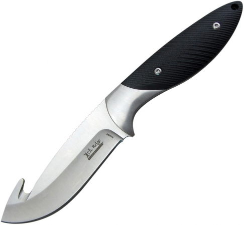 9" overall. 4.25" satin finish 8Cr13MoV stainless guthook blade. Black G10 handle. Stainless guard. Full tang. Black leather belt sheath. Boxed.