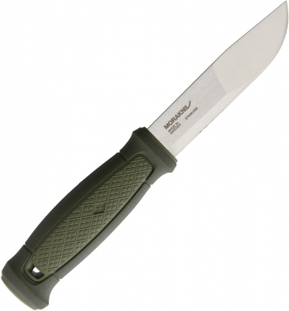 Overall: 9"; Blade: 4.25" l Stainless l Standard Edge l Satin Finish; Handle: Green l TPR; Other Info: Lanyard Hole. OD green plastic belt sheath with drain holes. Boxed.