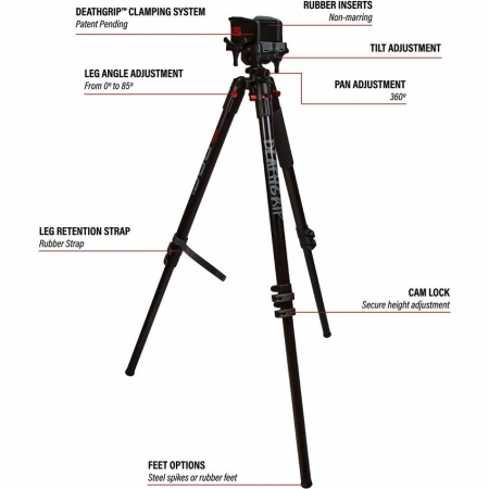 The Battenfeld BOG Deathgrip Aluminum Tripod is engineered to be the most stable shooting platform for its price point. Durable, aluminum construction secures any weapon for hands-free use. Integral bubble level. Retractable steel spikes secure into virtually any terrain. Three-position leg lock for prone, kneeling, sitting and standing positions. Up to 72" of height adjustment.