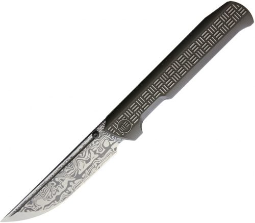 Framelock. 5" closed. 4" satin finish Damascus drop point blade. Grey textured titanium handle. Thumb stud. Pocket clip. Black nylon zippered storage case. Boxed.