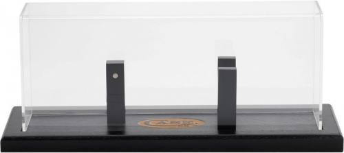 Stained Walnut wood base with engraved Case logo and plexiglass cover. Brass plate for engraving. Knife not included. Base dimensions: 13.75" x 4.13" x 1". Dome dimensions: 13.38" x 5.38" x 4.75". Weight: 4 lbs. Boxed.
