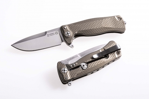 4" closed. 3" satin finish Sleipner tool steel drop point blade. Bronze textured titanium handle. Extended tang. Glass breaker. Lanyard hole. Pocket clip. Black leather belt sheath. Boxed.