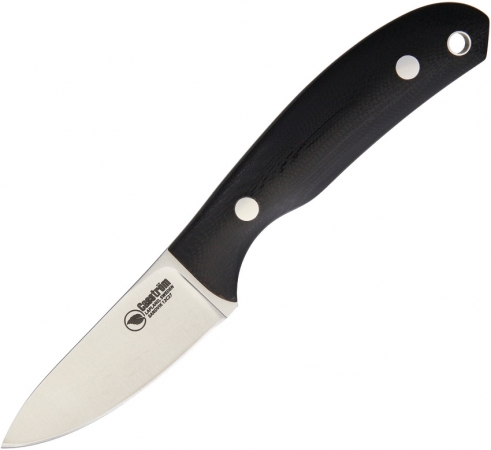 Overall: 6.375"; Blade: 2.5" l 12C27 Stainless l Standard Edge l Satin Finish; Handle: Black l G10; Other Info: Lanyard Hole l Full Tang. Brown leather belt sheath. Boxed.