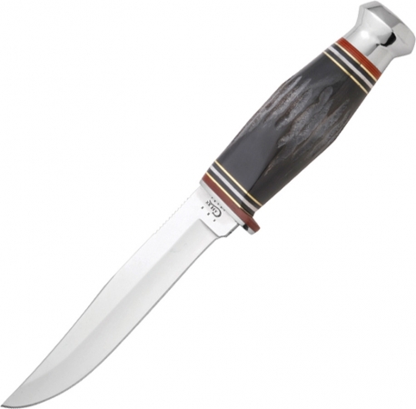 BH65-5SS pattern. 9" overall. 5" stainless sabre/concave ground clip blade. Jigged black buffalo horn handles with stainless guard and aluminum pommel. Black leather belt sheath.