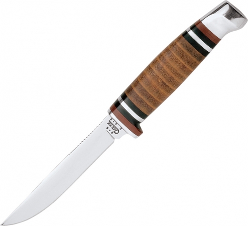 Knife. M3 FINN SS pattern. 6 1/2" overall. 3 1/8" mirror-polished stainless concave ground blade. Polished leather handle with nickel silver guard and polished aluminum pommel. Brown leather belt sheath.