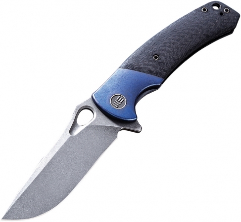 This model of the WE Knife Co. Bishop features a blue anodized handle with carbon fiber overlays and a stonewashed blade.