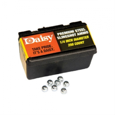 250 count 1/4" diameter zinc-plated solid steel shot in a convenient box with belt clip.