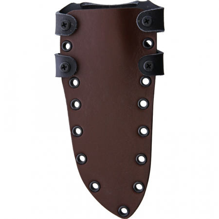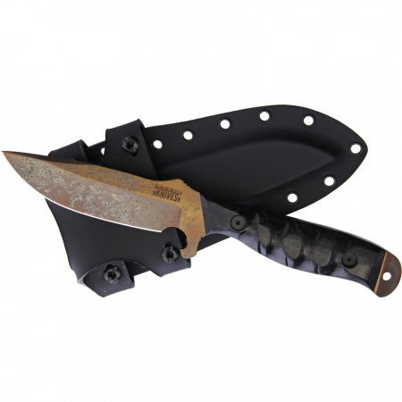 9.63" (24.46cm) overall. 4.5" (11.43cm) Arizona copper finish CPM-3V carbon steel blade. Marbled sculpted carbon fiber handle. Full, extended tang. Lanyard hole. Black Kydex and brown leather belt sheath. Serialized. Blue liners. Boxed.