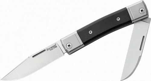 This model of the LionSteel BestMan has both a clip point and wharncliffe blade. The handle has ebony wood inserts with titanium bolsters.