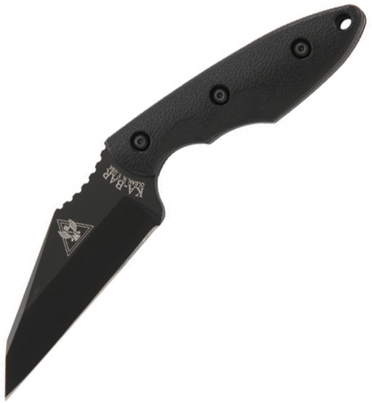 7 1/4" overall. 3 1/2" black finish 1095 Cro-Van steel wharncliffe tanto blade. Full tang, Black Zytel handles. Lanyard hole. Black nylon belt sheath with metal clip can be attached at multiple angles.