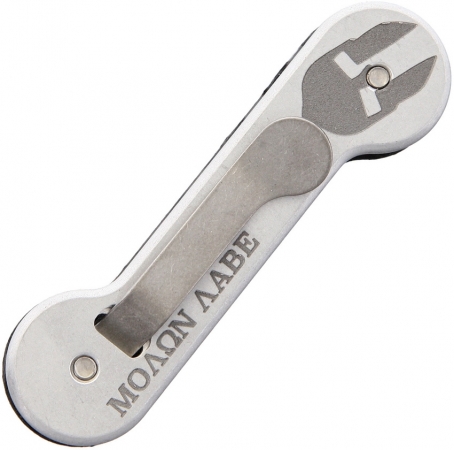 KeyBar Key Holder. 3.5" overall. Tools include: Lanyard loop l Pocket clip. Dark carbon fiber top handle. Gray aluminum bottom handle with Spartan helmet artwork and " _ " (Greek meaning "Come and Take Them). Three sets of screws included (to hold 4, 8, or 12 keys). O-rings keep keys snug and allow for adjustment of tension. Washers between keys for easy deployment. Holds up to 12 keys. Keys and accessories not included. Hang packaged.