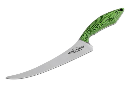 The new White River Step-Up Fillet knife design. This hand finished full tang knife is made from precision ground, heat treated and cryogenically tempered CPM S35VN. The razor sharp edge is then leather honed to easily slice through fish with the utmost control and ease. The new tough G10 handle creates a strong positive no slip hand purchase in wet and even slimy conditions. The step up design affords excellent visibility of blade location for precise filleting and also provides extra knuckle clearance for very thin filleting.