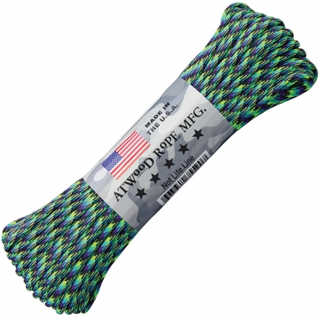 550 cord. 7 strand core. Color: Invader (light blue, green, purple, black). 100 ft. Bulk packed.