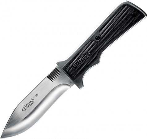 9 1/2" overall. 4 1/2" stainless drop point blade. Stainless handles with black checked synthetic grips. Leather belt sheath.