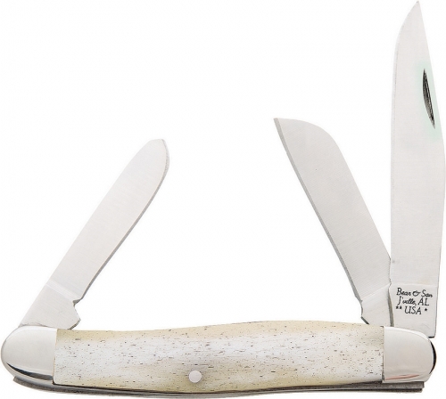 3.88" (9.86cm) closed. Satin finish 440 stainless clip, sheepsfoot, and spey blades. White smooth bone handle. Nickel silver bolster(s). Boxed.