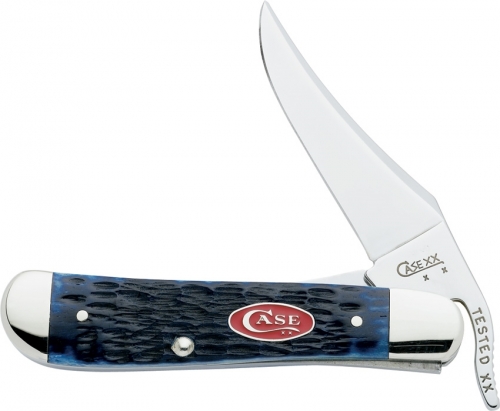 61953LSS pattern. 4 1/4" closed linerlock. Stainless clip blade with extended tang for one hand opening. Navy blue jigged bone handles with bright red Case logo shield and nickel silver bolsters.