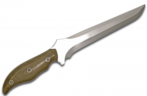 Chili Pepper handles. Why a different handle option for knives that many think have already reached perfection? The answer is because there are different hand sizes, applications and personal tastes. The Chili Pepper handles may look different than anything you've seen before, but when you put it in your hand, you'll appreciate the human engineering that went into it. Having a greater surface area means rapid blade response with minimal hand and wrist movement. The convex profile curves provide a strong, sure, comfortable grip while providing smooth contour lines that make extended chopping chores breeze by. That same solid, non-slip grip gives you confidence that the Chili Pepper design will remain firm in your hand, even if your hand is covered in slippery fluids, or the blade is subjected to radical torque in your hand. When you first pick up a Chili Pepper handled Mercworx, put the grip in your strong hand while keeping the blade sheathed. Now, with your other hand, grasp the sheathed blade end, and twist it. You will feel the sideways torque putting pressure on your ring finger knuckle. That's why the Chili Pepper handle is flared at this crucial area; to give you the maximum possible lateral gripping surface. Then un-sheath it, and feel the blade come alive in your hand. You'll see why many people call them "the perfect fighting blade." This is the combat knife in Excelsus; the warriors perfect battle blade.