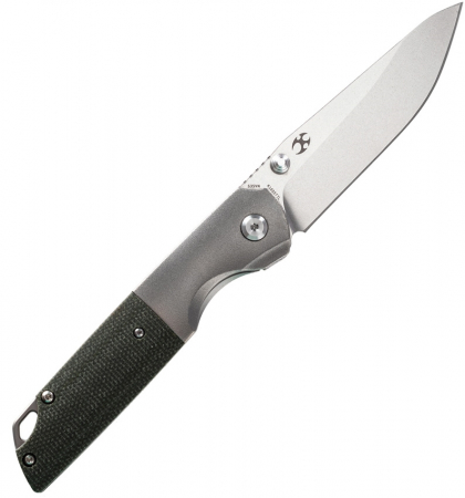 4.5" (11.43cm) closed. 3.5" (8.89cm) stonewash finish S35VN stainless blade. Gray titanium handle with micarta inlay. Thumb stud. Lanyard hole. Pocket clip. Black nylon pouch. Boxed.
