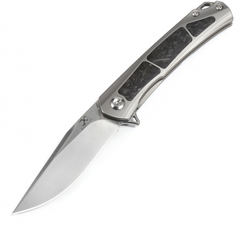 4" (10.16cm) closed. 3" (7.62cm) satin finish CPM S35VN stainless clip point blade. Gray titanium handle with carbon fiber inlay. Extended tang. Lanyard hole. Pocket clip. Black nylon pouch. Boxed.