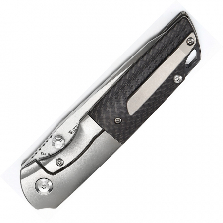 4.5" (11.43cm) closed. 3.5" (8.89cm) stonewash and satin finish CPM S35VN stainless tanto blade. Gray titanium handle with carbon fiber inlay. Thumb stud. Lanyard hole. Pocket clip. Black nylon pouch. Boxed.