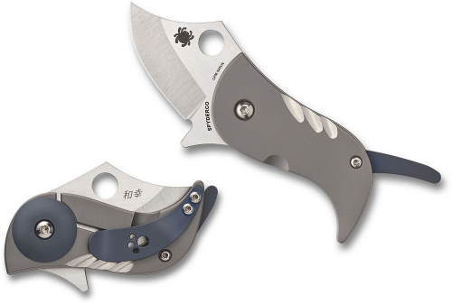 Japanese knifemaker Kazuyuki Sakurai specializes in intricate, handcrafted folding knives, many of which are inspired by the shapes of animals. Some of his most popular designs are the dog-shaped knives in his "Pochi" (poh-chee) series, which draws its name from the most common Japanese dog name, roughly the equivalent of "Spot." His first Spyderco collaboration faithfully translates this novel design into a unique production folder with a hollow-ground CPM-S45VN stainless blade, a bead-blasted titanium handle, a Reeve Integral Lock (RIL), and a blue-anodized folding "tail," titanium pocket clip, and pivot-pin accent.