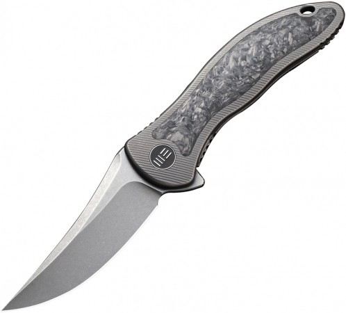 4" (10.16cm) closed. 3" (7.62cm) stonewash finish CPM-20CV stainless trailing point blade. Gray titanium handle with shredded carbon fiber inlay. Extended tang. Lanyard hole. Pocket clip. Black nylon zippered storage case. Boxed.
