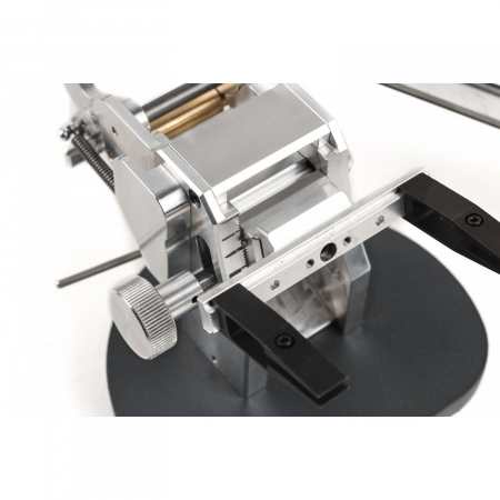 Dimensions: 4.4" x 5.1" x 5.3". Aluminum alloy body. Steel clamps. Comes with: Body; Abrasive holder; (3) diamond plates (Extra Coarse, Medium, Fine); (5) Alcohol wipes; Permanent marker; 2mm clamps screwdriver; Spare parts (bumpers, screws, Allen wrench). Sharpening angle is constant all along the edge. Rotary mechanism is calibrated from production. Rotary mechanism that allows you to flip the clamped knife over without unclamping. Stepless angle setup. Easy installation. Universal abrasive holder. Boxed.