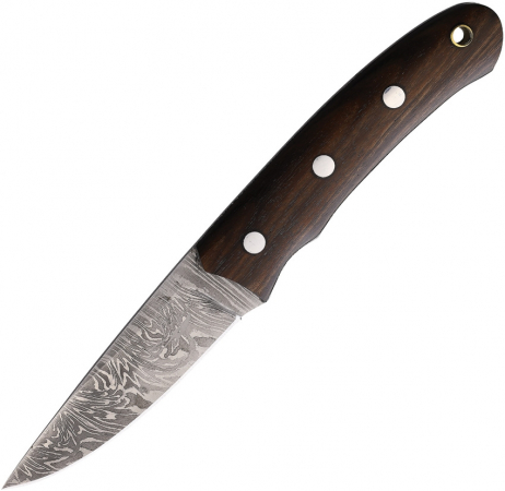 8" (20.32cm) overall. 3.5" (8.89cm) Damascus steel blade. Walnut handle. Full tang. Lanyard hole. Brown leather belt sheath. Bulk packed.