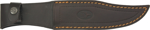 12" overall. 6 1/4" stainless bowie blade. Crown stag handle with brass guard. Leather lanyard. Brown leather belt sheath.