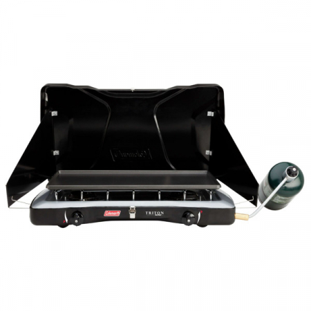Take camp cooking to the next level with the Coleman Triton Propane Stove. Just light it up and dial in your heat with the two independently adjustable burners and you can be cooking over 22,000 BTUs of power in no time. The cooking surface offers plenty of room to fit a 12-in. and 10-in. pan simultaneously. Meanwhile, the PerfectFlow pressure control technology keeps the heat steady, even in extreme conditions. WindBlock panels help shield your flame from wind, and they adjust if you need to fit a larger pan. When the meal is over, the chrome-plated grate removes for simple and quick cleanup, and the heavy-duty latch will keep the lid secure until you whip up your next family dinner.