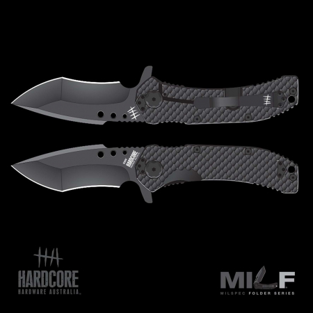The MILF-01 from Hardcore Hardware Australia is a mid-sized Recurve utility folding knife, offering the optimum balance between weight, strength, and cutting power.