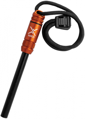 6" overall. Waterproof tinder storage capsule made from CNC machined aluminum. 0.5" diameter replaceable ferro rod. 12" of repair tape and tinder included. Color: Orange. Boxed.