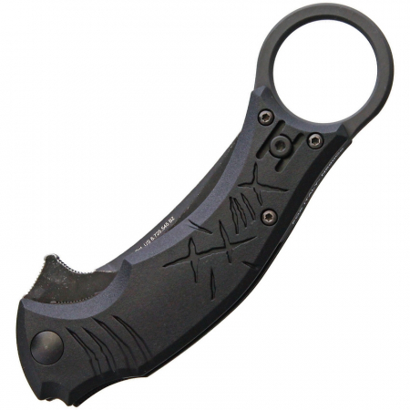 4.75" closed. 2.75" black finish D2 tool steel blade. Black nylon handle. Extended tang. Pocket clip. Finger ring. Boxed.
