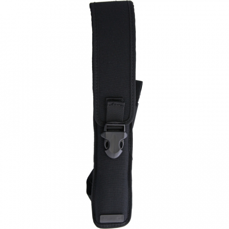 12.25" (31.12cm) overall. 7.63" (19.38cm) black MIL-C-13924 burnished Bohler N690 stainless blade. Black finger grooved Forprene handle. This knife features a reversible blade. It ships as originally conceived, shorter false edge facing downwards, but this blade configuration can be reversed for effectiveness in actual use. Third generation thigh sheath. Black nylon sheath. Boxed.