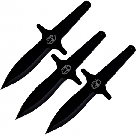 14.25" (36.2cm) overall. 7.5" (19.05cm) black finish 3Cr13 stainless blade. One-piece construction. Lanyard hole. Weight: 1.3lb. Set of three. Blade guards are formulated to protect throwers from bounces and knives flying through protective fencing while still allowing for the highest precision. Extended dual bladed knife allows for full coverage over a full inch down the blade. Boxed.