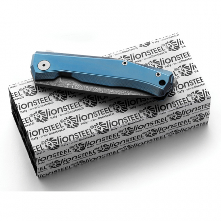 4.63" (11.76cm) closed. 3.25" (8.26cm) Chad Nichols raindrop Damascus steel blade. Blue stonewash finish titanium handle. Extended tang. Lanyard hole. Glass breaker. Pocket clip. Boxed.