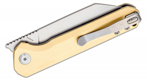 The Bulldozer features a deep carry pocket clip (tip up, right carry) and feels incredibly slim in the pocket, despite the large cutting edge. This knife is easy to carry every day and can easily fit in pockets without feeling overbearing. The brass scales add some noticable weight and provide an elegant appearance that will patina over time. The front flipper is smooth due to ceramic bearings in the pivot and the sturdy liner lock holds the blade firmly in place while disengaging the lock leads to smooth, drop-shut action.
