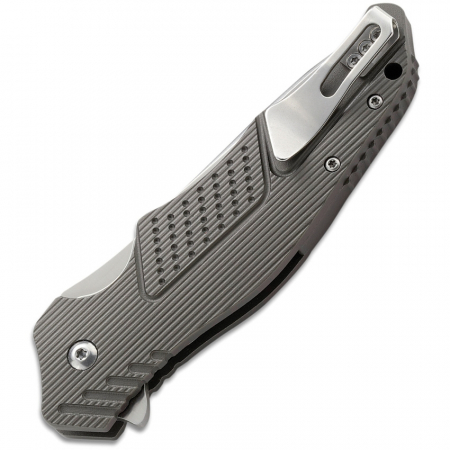 4.63" closed. 3.5" satin finish 8Cr13MoV stainless drop point blade. Gray aluminum handle. Extended tang. Lanyard hole. Pocket clip. Boxed.