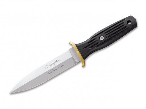 The smaller and thus more handy version of the Applegate-Fairbairn has been developed according to the same concept as its big brother. Fiberglass-reinforced Delrin handle with integrated stainless steel weights, brass cross-guard and 440C blade steel. The blade has on the one side a typical double conical dagger grind and on the other side a hollow grind. Delivery includes a Kydex sheath and a large Tek-Lok.