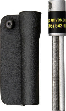 Consists of 3 rods which are 3" overall including handle. Rods are 2" overall. Two silver rods are magnesium. When ignited, this material will burn quickly at a temperature of +5000 degrees. Use a knife to shave a small amount of magnesium into a pile (approximately the size of a nickel) immediately next to or on top of the tinder. The dark color rod is Ferrocium. When scraped with a knife this rod will produce a very hot spark (+1000 degrees). Draw the knife edge at a right angle firmly down the entire length of the ferrocium rod to ignite the pile of magnesium shavings on the tinder. All 3 rods are pressed into a 3/4" black aircraft aluminum machined barrel. Includes 2 mounting screws to attach to most Kydex sheaths.