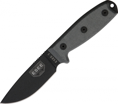 8.25" overall. 3.75" black powder coated double edge 1095HC steel blade. Black micarta handle. Full, extended tang. Lanyard hole. Coyote brown molded plastic sheath with clip plate attachment and nylon MOLLE compatible belt sheath.