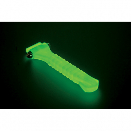 5.5" overall. Shatters tempered car glass and cuts seat belts. Glows in the dark. Clamping system for screwless mounting on car door. Color: Yellow. Boxed with hanging tab.