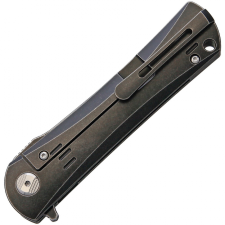 4.63" closed. 3.63" black stonewash finish S35VN stainless tanto blade. Black stonewash finish titanium handle. Extended tang. Lanyard hole. Pocket clip. Black nylon zippered storage case. Boxed.