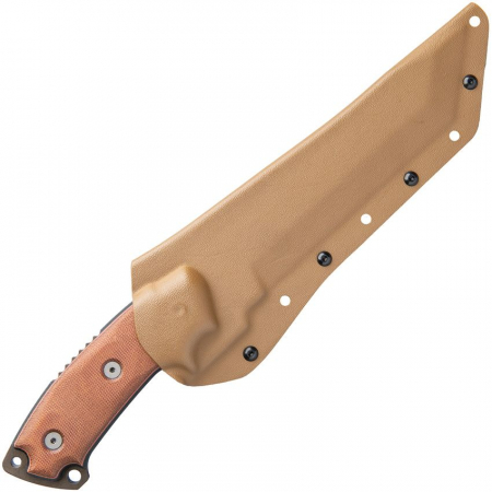 13" (33.02cm) overall. 7.63" (19.38cm) sawback 1095HC steel Hunter's point blade. Tan canvas micarta handle. Full, extended tang. Lanyard hole. Midnight bronze finish blade. Black and red liners. Tan Kydex belt sheath. Bulk packed.