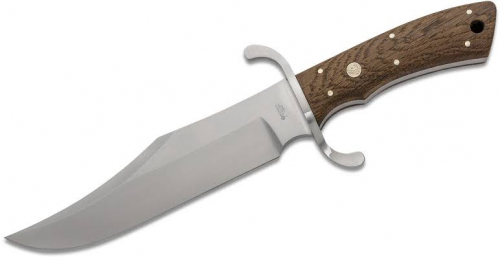 The design of the traditional Boker Bowie was based on original drafts from the early 19th century and equipped with an extremely stable, 6.4 mm thick blade made from N690. The name of the knife goes back to James "Jim" Bowie, the famous pioneer and soldier who is revered as a hero of the Wild West. Contrary to the widely copied Sheffield Bowie, the variations of this outdoor knife resemble the early American Bowie with its s-shaped stainless steel crossguard sporting a finely satinized surface. The exquisite scales of domestic oak lend the Boker Bowie even more authenticity. Comes with a high-quality Western leather sheath in black, design based on the original.