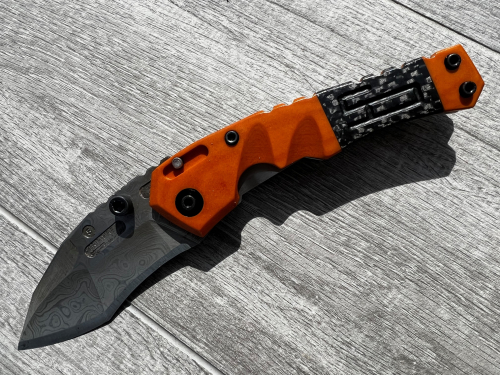 This TripWire II custom made by Dwaine Carillo features Damascus blade with dual thumbstuds and notched thumbrest.