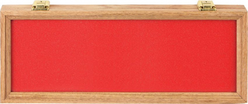 Measures 18" x 7" x 2 3/8". Foam lined with red foam cover. Locking hinges. Comes with two keys.